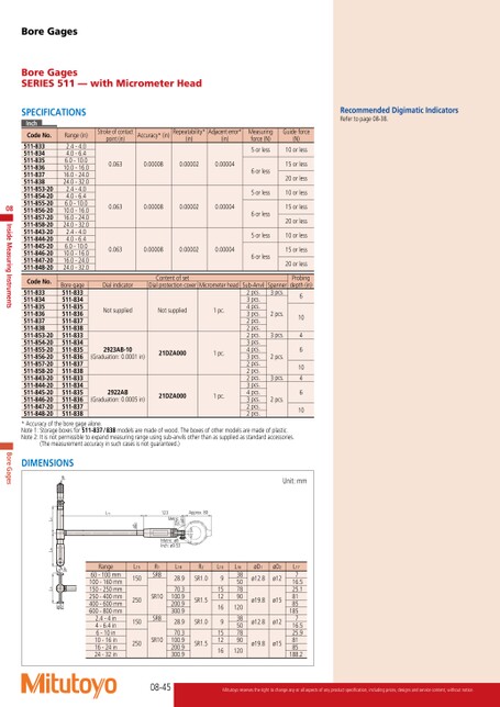 SPECIFICATIONSInchCodeNo.Range(in)2.4-4.04.0-6.46.0-10.010.0-16.016.0-24.024.0-32.02.4-4.04.0-6.46.0-10.010.0-16.016.0-24.024.0-32.02.4-4.04.0-6.46.0-10.010.0-16.016.0-24.024.0-32.0511-833511-834511-835511-836511-837511-838511-853-20511-854-20511-855-20511-856-20511-857-20511-858-20511-843-20511-844-20511-845-20511-846-20511-847-20511-848-20CodeNo.RecommendedDigimaticIndicatorsRefertopage08-38.Strokeofcontactpoint(in)Accuracy*(in)Repeatability*(in)Adjacenterror*(in)Measuringforce(N)Guideforce(N)0.0630.000080.000020.000040.0630.000080.000020.000040.0630.000080.000020.000045orless10orless6orless15orless20orless5orless10orless6orless15orless20orless5orless10orless6orless15orless20orlessContentofsetProbingdepth(in)NotsuppliedNotsupplied1pc.3pcs.2pcs.3pcs.DialindicatorSub-AnvilSpannerDialprotectioncoverMicrometerheadBoregage511-833511-834511-835511-836511-837511-838511-833511-834511-835511-836511-837511-838511-833511-834511-835511-836511-837511-838511-833511-834511-835511-836511-837511-838511-853-20511-854-20511-855-20511-856-20511-857-20511-858-20511-843-20511-844-20511-845-20511-846-20511-847-20511-848-20*Accuracyoftheboregagealone.Note1:Storageboxesfor511-837/838modelsaremadeofwood.Theboxesofothermodelsaremadeofplastic.Note2:Itisnotpermissibletoexpandmeasuringrangeusingsub-anvilsotherthanassuppliedasstandardaccessories.2pcs.3pcs.4pcs.3pcs.2pcs.2pcs.2pcs.3pcs.4pcs.3pcs.2pcs.2pcs.2pcs.3pcs.4pcs.3pcs.2pcs.2pcs.(Graduation:0.0005in)(Graduation:0.0001in)2pcs.3pcs.2923AB-1021DZA0002pcs.2922AB21DZA0001pc.1pc.61046104610L17716.525.18185185716.525.98185188.2123Approx.80Metric:32Ich:23Metric:ø8Inch:ø9.53R2SR1.0SR1.5SR1.0SR1.5L1091512169151216L163850789012038507890120øD1ø12.8øD2ø12ø19.8ø15ø12.8ø12ø19.8ø15R1SR8SR10SR8SR10L1828.970.3100.9200.9300.928.970.3100.9200.9300.908-45øD2L15150250150250L15Range60-100mm100-160mm150-250mm250-400mm400-600mm600-800mm2.4-4in4-6.4in6-10in10-16in16-24in24-32inL10R2øD1L17L18L16Unit:mmDIMENSIONSR1BoreGages(Themeasurementaccuracyinsuchcasesisnotguaranteed.)BoreGagesBoreGagesSERIES511—withMicrometerHead