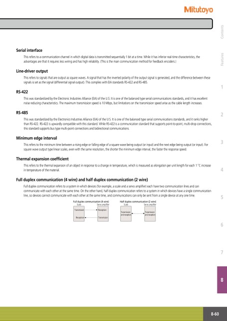 SerialinterfaceThisreferstoacommunicationchannelinwhichdigitaldataistransmittedsequentially1bitatatime.Whileithasinferiorreal-timecharacteristics,theadvantagesarethatitrequireslesswiringandhashighreliability.(Thisisthemaincommunicationmethodforfeedbackencoders.)Line-driveroutputThisreferstosignalsthatareoutputassquarewaves.Asignalthathastheinvertedpolarityoftheoutputsignalisgenerated,andthedifferencebetweenthesesignalsissetasthesignal(differentialsignaloutput).ThiscomplieswithEIAstandardsRS-422andRS-485.RS-422ThiswasstandardizedbytheElectronicIndustriesAlliance(EIA)oftheU.S.Itisoneofthebalancedtypeserialcommunicationsstandards,andithasexcellentnoisereducingcharacteristics.Themaximumtransmissionspeedis10Mbps,butlimitationsonthetransmissionspeedariseasthecablelengthincreases.RS-485ThiswasstandardizedbytheElectronicsIndustriesAlliance(EIA)oftheU.S.Itisoneofthebalancedtypeserialcommunicationsstandards,anditrankshigherthanRS-422.RS-422isupwardlycompatiblewiththisstandard.WhileRS-422isacommunicationstandardthatsupportspoint-to-point,multi-dropconnections,thisstandardsupportsbustypemulti-pointconnectionsandbidirectionalcommunications.MinimumedgeintervalThisreferstotheminimumtimebetweenarisingedgeorfallingedgeofasquarewavebeingoutput(orinput)andthenextedgebeingoutput(orinput).Forsquarewaveoutputtypelinearscales,evenwiththesameresolution,theshortertheminimumedgeinterval,thefastertheresponsespeed.ThermalexpansioncoefficientThisreferstothethermalexpansionofanobjectinresponsetoachangeintemperature,whichismeasuredaselongationperunitlengthforeach1°Cincreaseintemperatureofthematerial.Fullduplexcommunication(4wire)andhalfduplexcommunication(2wire)Fullduplexcommunicationreferstoasysteminwhichdevices(forexample,ascaleandaservoamplifier)eachhavetwocommunicationlinesandcancommunicatewitheachotheratthesametime.Ontheotherhand,halfduplexcommunicationreferstoasysteminwhichdeviceshaveasinglecommunicationline,sodevicescannotcommunicatewitheachotheratthesametime,andcommunicationscanonlybesentfromasingledeviceatanyonetime.Fullduplexcommunication(4wire)ServoamplifierScaleHalfduplexcommunication(2wire)ServoamplifierScaleTransmissionReceptionReceptionTransmissionTransmissionandreceptionTransmissionandreception8-60